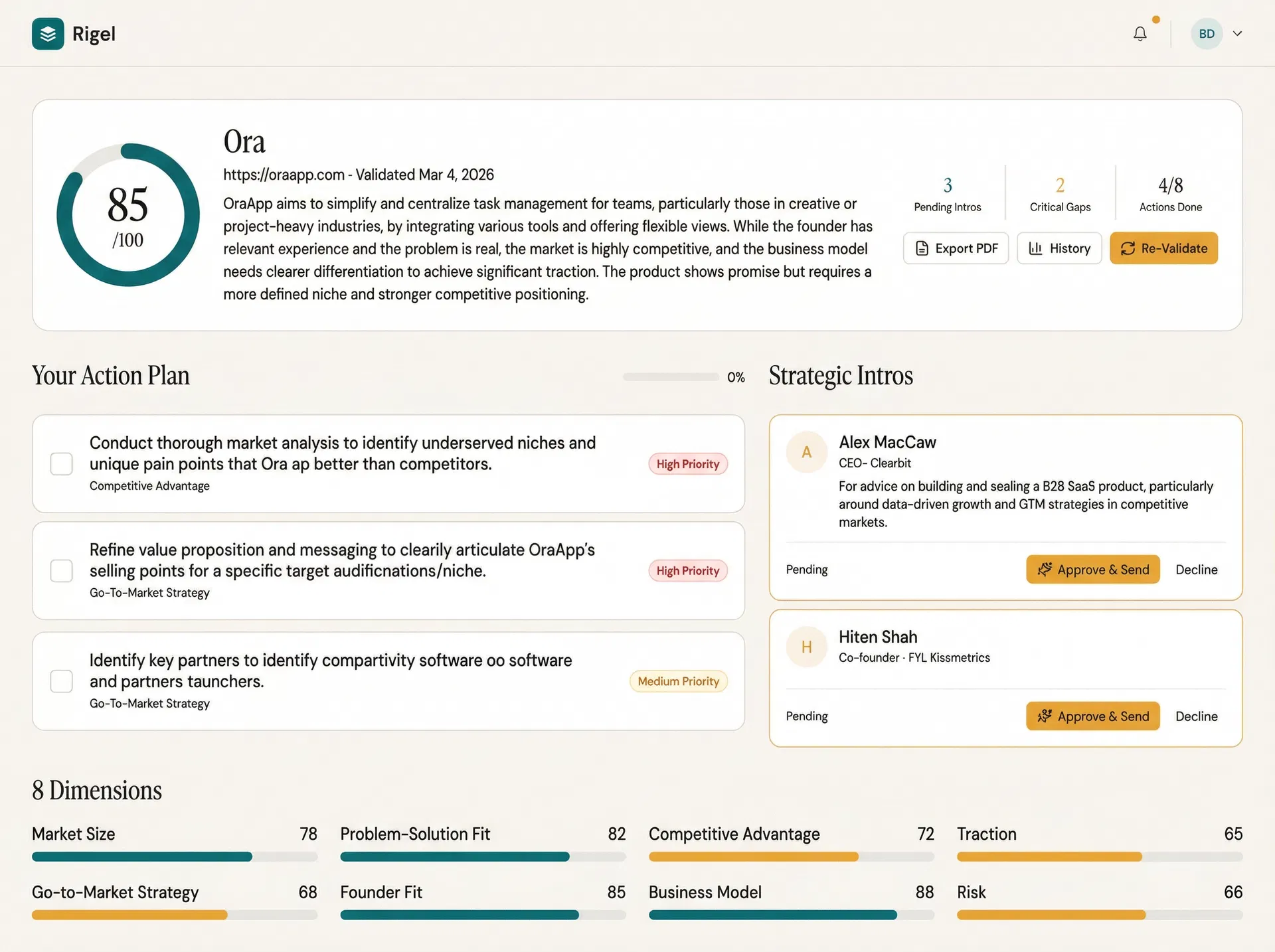 “Most validation tools told me my idea scored 65. Rigel told me WHY it was 65 and connected me to 4 people who helped me fix it. I'm now at 82 and raising my seed round.”